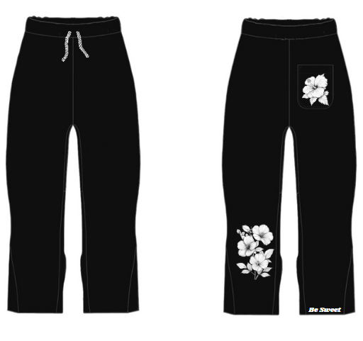 Na parte da frente, mantêm um visual limpo, com cordões ajustáveis na cintura. Já na parte de trás, destacam-se pelos detalhes florais a branco — um no bolso e outro na perna — que dão personalidade à peça. Junto à bainha, o pequeno texto “Be Sweet” reforça a identidade da marca de forma subtil mas marcante.