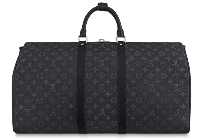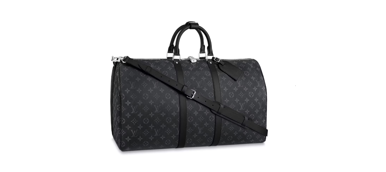 Esta autêntica Louis Vuitton Keepall Bandoulière Monogram Eclipse 55 em Preto/Cinza é uma mala de viagem elegante, confeccionada na icónica lona Monogram Eclipse da Louis Vuitton em tons de preto.