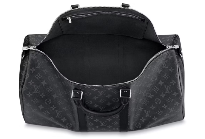 Os fechos de correr prateados abrem para um interior espaçoso em tecido preto, com um bolso interno com fecho. Trata-se de uma excelente mala de viagem, com todo o luxo e estilo da Louis Vuitton, disponível para compra e venda online.